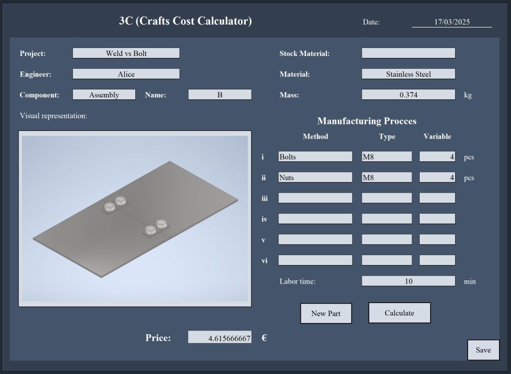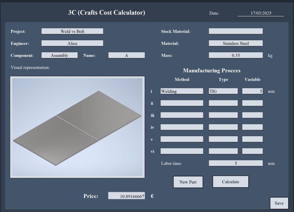 The 3C (Crafts Cost Calculator) is a Microsoft Excel-based system designed to calculate manufacturing and assembly costs efficiently. It allows users to input design parameters and production data to generate automatic estimates of labor hours, material usage, process steps, and associated costs. In this study, the 3C tool is enhanced with assembly-specific logic to support real-time comparison between welding and bolted assemblies.