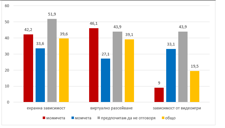 Таблица 4. Полово разпределение на учениците с екранната зависимост, виртуално разсейване и зависимост от видеоигри