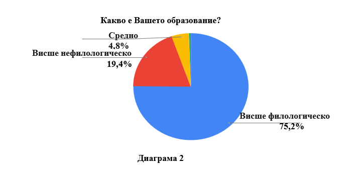 Най-голям е броят на респондентите с висше филологическо образование (завършено или в процес на обучение) – 75,2%, следван от лицата с висше нефилологическо образование (завършено или в процес на обучение) – 19,4%. 4,8% са респондентите със средно образование. 0,6% са участниците с основно образование.