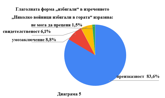 Преизказната семантика на формата избягали в изречението „Няколко войници избягали в гората“ е доловена от 83,6% от анкетираните лица. Според 8,8% от респондентите с нейна помощ се изразява умозаключение, а 6,1% от участниците в допитването са на мнение, че тя функционира в свидетелски контекст.