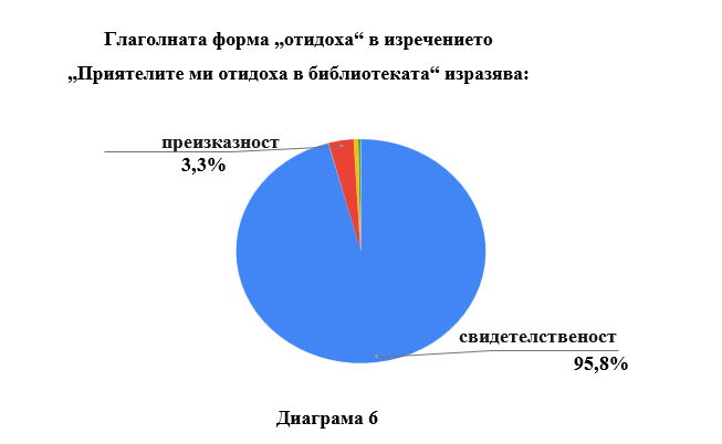 Интересно е, че разпознаването на свидетелското значение на формата отидоха в изречението „Приятелите ми отидоха в библиотеката“ е по-категорично от долавянето на преизказната семантика на формите търсел и избягали. 95,8% от респондентите смятат, че с помощта на граматичното образувание отидоха говорещото лице се представя като свидетел (очевидец) на съобщавания факт. Известно е, че свидетелските форми могат да се използват транспозитивно, когато говорещият или пишещият не е бил очевидец на предаваната информация, но желае да покаже, че твърдението му се отличава с висока степен на достоверност (вж. Nitsolova, 2008): Родопчани ремонтираха сами 6 км път към Смолян (https://www.marica.bg/). В примера, който избрахме да включим в своята анкета, притежателното местоимение „ми“ уточнява, че глаголната форма изразява действие, засягащо лица от близкото обкръжение на говорещия. Макар че посесивните местоимения не са част от групата на периферийните свидетелски модификатори в съвременния български език, те биха могли да подскажат, че свидетелската форма е използвана в прякото си значение.