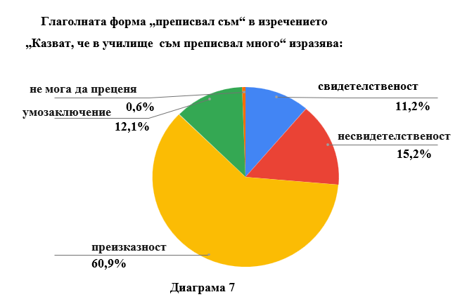 В седмия въпрос бе включено изречението „Казват, че в училище съм преписвал много“, в което заедно са използвани лексикален преизказен модификатор и ренаративна глаголна форма. То представя специфична ситуация, в която говорещото лице разказва нещо за себе си, позовавайки се на думите на друг. Липсата на ангажираност със свидетелската позиция на говорещия в подобни примери ни подтикна да включим следните опции, от които респондентите могат да избират: говорещото лице е свидетел на съобщавания факт; предава (преизказва) думите на друго лице; не е свидетел на съобщавания факт; изразява умозаключение; не мога да преценя. Според теоретичната рамка, към която се придържаме, значенията преизказност и несвидетелственост не се изключват взаимно. Разделянето им тук е резултат от желанието ни да проверим дали дори при особена комуникативна ситуация, в която говорещото лице преизказва събития, на които е присъствало, повечето респонденти ще предпочетат да отбележат, че главното значение на ренаратива е преизказност. Показателен е фактът, че 60,9% от участниците в допитването смятат, че в избрания пример формата „преписвал съм“ изразява преизказност. 15,2% от респондентите са предпочели да маркират „не е свидетел на съобщавания факт“. Причината според нас би могла да се дължи на обстоятелството, че ренаративните форми имат експлицитен формален показател, докато несвидетелските граматични образувания са немаркирани.