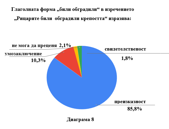 Възможността в съвременния българския език говорещото лице да преизкаже резултата от определено действие, е илюстрирана в изречението „Рицарите били обградили крепостта“. 85,8% от участниците в допитването смятат, че формата „били обградили“ изразява преизказност. Изпускането на спомагателния глагол „съм“ обаче явно не се е оказало значещо за 10,3% от респондентите, които са на мнение, че с цитираното граматично образувание се изразява умозаключение.