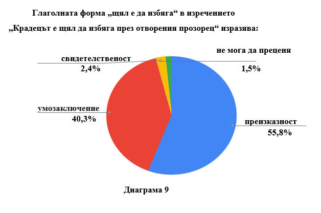 Интересно е, че по-голям процент от анкетираните лица разпознават преизказните форми и тяхното основно значение в сравнение с умозаключителните граматични образувания. Показателен в това отношение е фактът, че според 40,3% от респондентите с формата „щял е да избяга“ в примера „Крадецът е щял да избяга през отворения прозорец“ се изразява умозаключение, докато 55,8% мислят, че тя е преизказна.