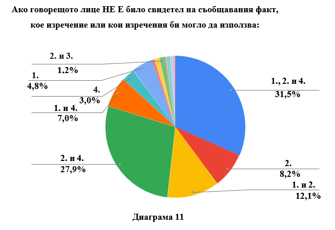 Последният въпрос от анкетата е свързан с желанието ни да проверим кои от типовете глаголни форми, които не съдържат морфемата -Х-/-ШЕ, се възприемат като несвидетелски от съвременните носители на езика. За целта формулирахме следното условие: Ако говорещото лице НЕ Е било свидетел на съобщавания факт, кое изречение или кои изречения би могло да използва: