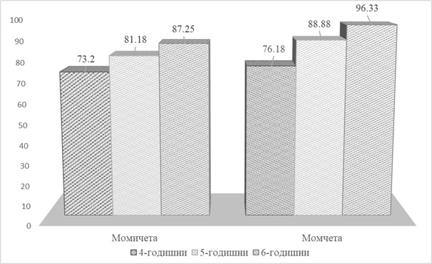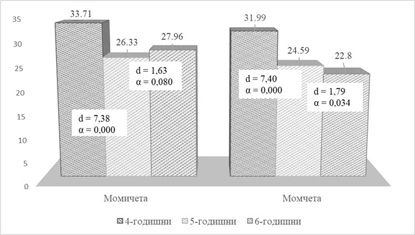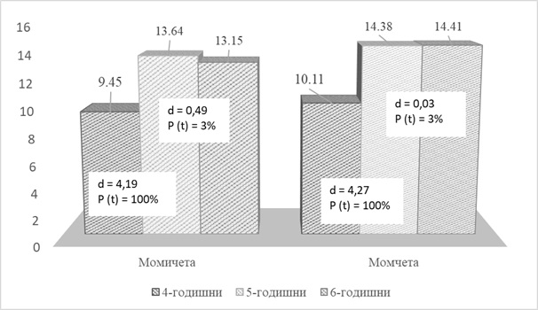 Динамиката на промените, представена на фиг. 1, свидетелства за положителни изменения при двата пола през изследвания период, от една страна, а от друга – за наличие на полови различия по отношение проявлението на разглежданата двигателна способност. Резултатите от двуфакторния дисперсионен анализ показват, че полът и принадлежността към възрастовата група влияят статистически значимо (съответно α =0,000 и α =0,010), като не се наблюдава смесване на ефекта от двата фактора. В тази връзка е логично и наличието на статистически достоверни полови различия по отношение на средното постижение за целия разглеждан период. Приложеният тест за хомогенност на групите на Тюки ни дава основание да обединим 5- и 6-годишните като отделна група както при момчетата, така и при момичетата. Затова проверихме достоверността на разликите между отделните групи чрез параметричния t-критерий на Стюдънт. Както при момчетата, така и при момичетата е налице статистически достоверен прираст между 4- и 5-годишна възраст, като ръстът от 4,27 и 4,19 успешни опита и в двата случая е подкрепен от ниво на гаранционна вероятност P (t) = 100%.