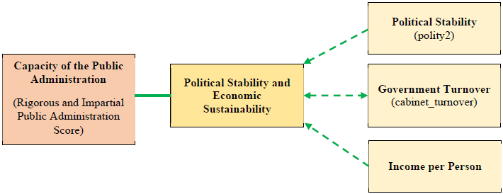 Figure 1. Conceptual model illustrating the relationship between administrative capacity, political stability, and economic development