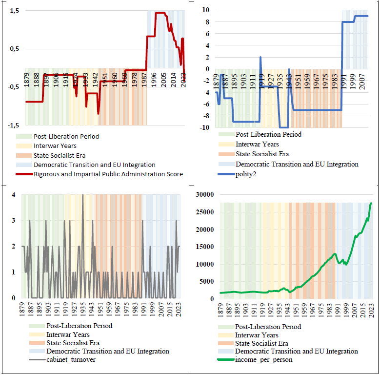 The empirical analysis traces the evolution of Bulgaria’s state capacity, political stability, and economic performance from 1878 to the present day. By examining changes in bureaucratic impartiality, regime type, government turnover, and real income per capita, the study clarifies how institutional development unfolded under successive political and economic regimes. Figure 2 shows the time-series trends of the key indicators throughout the entire period.